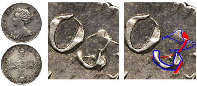 This note presents a 1703 VIGO shilling of Queen Anne with an unrecorded overdate 3 over 2. My thanks go to Alan Worby of MH Coins for the images and permission to publish. This prompted a quick search to see if any other specimens could be found. Online archives produced images of 74 specimens of sufficient quality to allow a die study of the reverse dies. A statistical analysis of the 16 different dies suggests that the die count is likely almost complete.