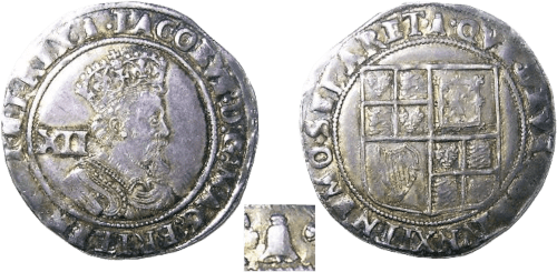 This note continues the die studies of James I shillings, working backwards through the mintmarks of the second issue. Here the mintmark Bell is presented – issued between 11th May 1610 and 9th May 1611 when £9 12s 8½d of silver was in the Pyx trial.