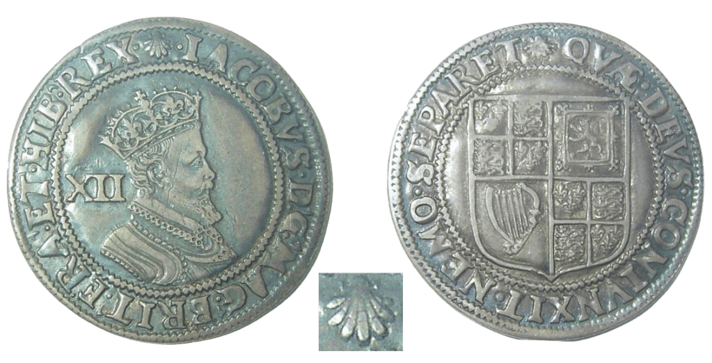 This note continues the die studies of James I shillings, working backwards through the mintmarks of the second issue. Here the mintmark Scallop is presented. On 30th June 1607 there was £75 0s 10d of silver at the trial of the pyx, representing coins struck since the previous trial on 10th July 1606, almost a year previously.