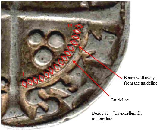 These suggestions just didn’t “feel right”. In this note I would like to suggest an alternative and simpler hypothesis – that a single curved punch bearing the beaded quarter circle was used to create the sections of the beaded inner circle. When entered incorrectly, the beaded inner circle is misaligned relative to the guideline.